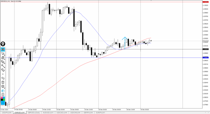 4時間足ではダウをカウント(青ライン)してみると上昇ダウで4時間足MAにも支えられている局面だと思います。